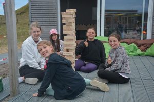 Alles war vorbereitet für die Olympiade am Nachmittag. Da es jedoch immer wärmer wurde, entschied Sporticus, dass man doch auch am Strand Sport machen konnte! So packten alle ihre Badesachen und Strandspielzeug ein und wir machten uns auf den Weg zur Weißen Düne, um das gute Wetter auszunutzen. Dann ging es auch schon ins Wasser, um die körperliche Fitness zu fördern. Sporticus konnte leider nicht mitkommen, da sich das Gestein, aus dem er besteht, bei Salzwasser sofort auflöst und wollte auf dem Zeltplatz bleiben, um eine kleine Trainingseinheit durchzuführen – diese Muckis kommen schließlich nicht von allein! Nachdem wir ausgiebig planschen waren, aßen einige noch ein leckeres Eis oder buddelten im Sand und genossen die Sonne. Viel zu schnell war es Zeit, auf den Zeltplatz zurückzukehren und wir stärkten uns nach dem ausgiebigen Bad im Meer mit leckerem Abendbrot.